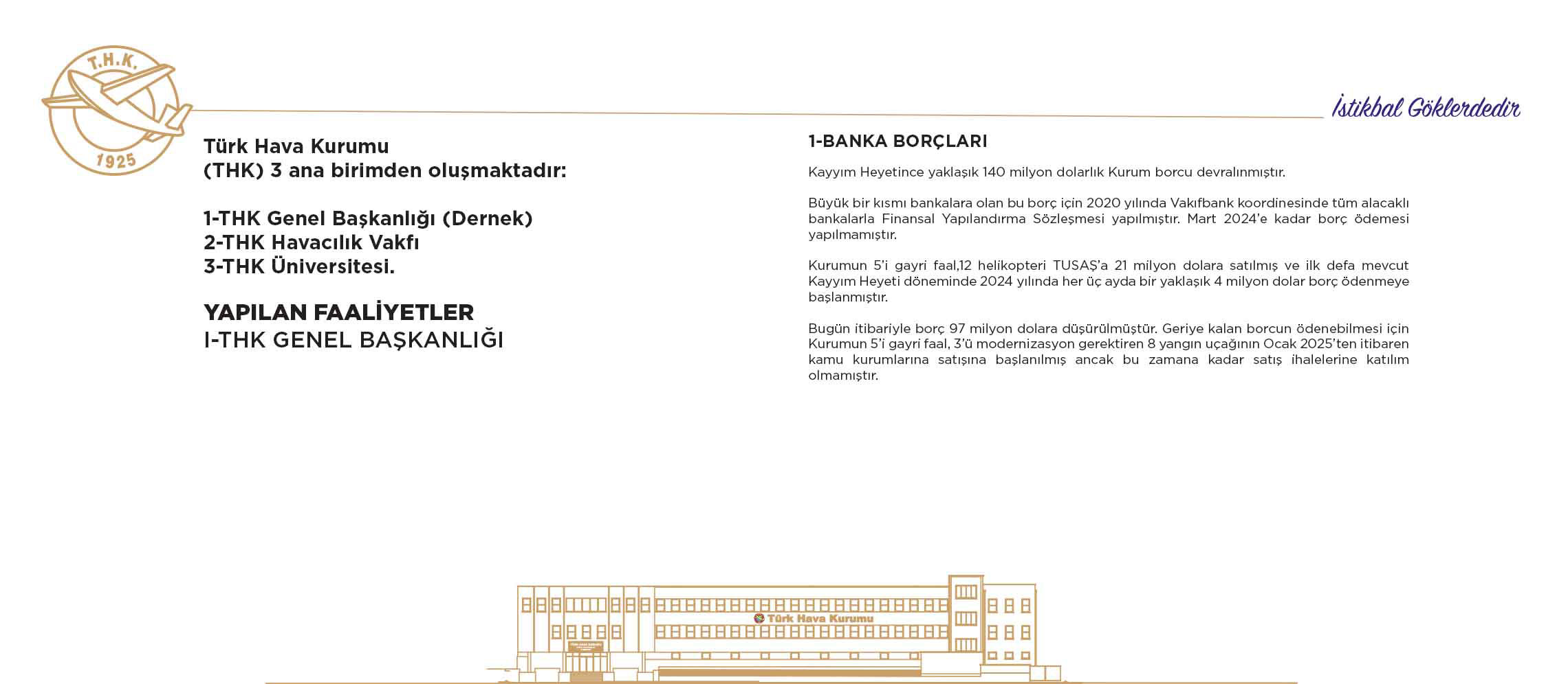 Bugün itibariyle borç 97 milyon dolara düşürülmüştür. Geriye kalan borcun ödenebilmesi için Kurumun 5’i gayri faal, 3’ü modernizasyon gerektiren 8 yangın uçağının Ocak 2025’ten itibaren kamu kurumlarına satışına başlanılmış ancak bu zamana kadar satış ihalelerine katılım olmamıştır.