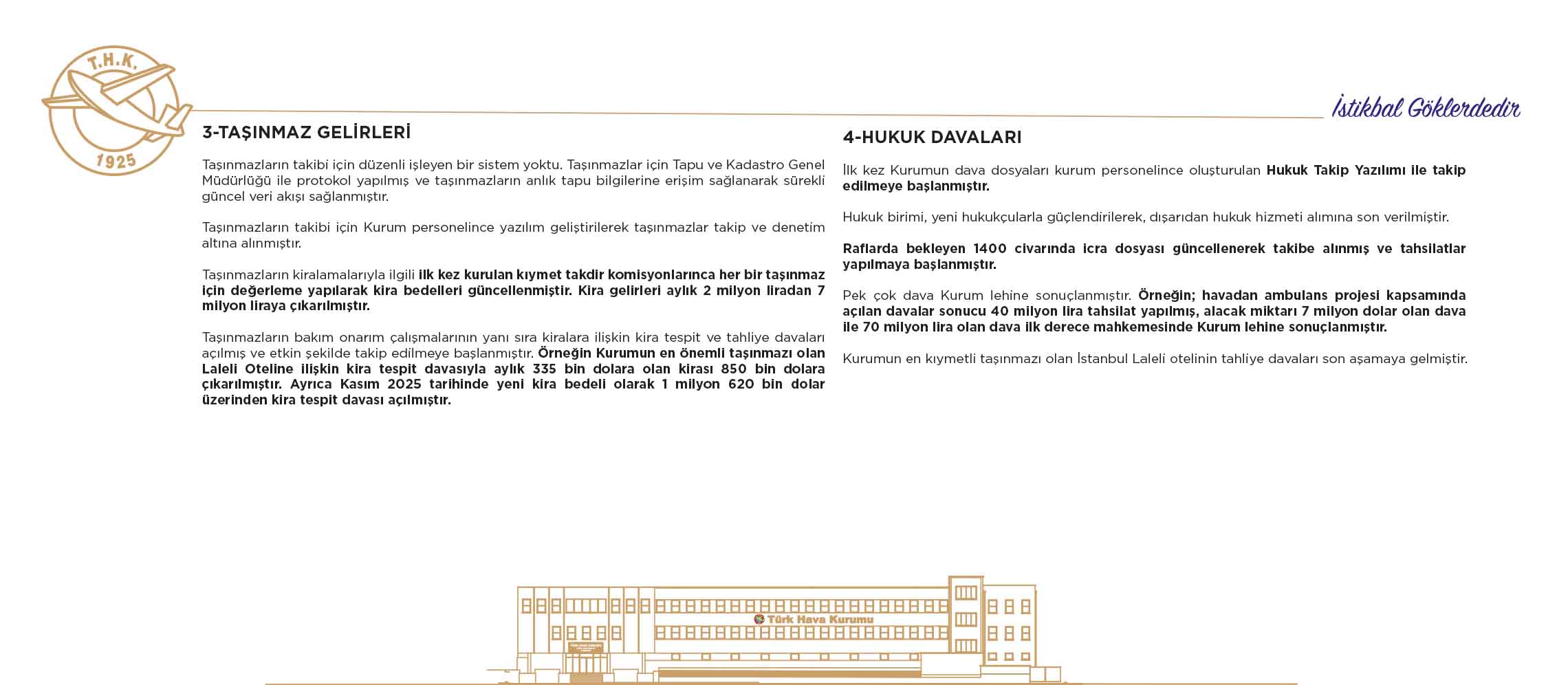 Taşınmazların bakım onarım çalışmalarının yanı sıra kiralara ilişkin kira tespit ve tahliye davaları açılmış ve etkin şekilde takip edilmeye başlanmıştır. Örneğin Kurumun en önemli taşınmazı olan Laleli Oteline ilişkin kira tespit davasıyla aylık 335 bin dolara olan kirası 850 bin dolara çıkarılmıştır. Ayrıca Kasım 2025 tarihinde yeni kira bedeli olarak 1 milyon 620 bin dolar üzerinden kira tespit davası açılmıştır.